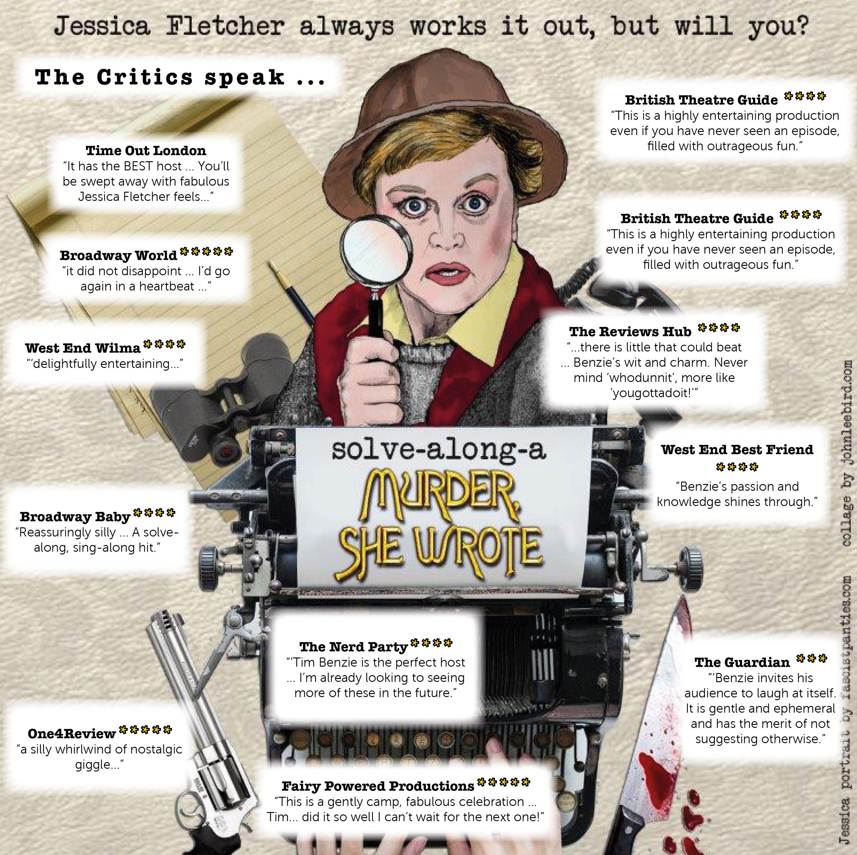 Solve-Along-A-Murder-She-Wrote is a unique and hilarious night featuring games, prizes and audience participation, with special permission from NBC Universal Television. See the show Time Out rated one of 2021 and 2019’s 50 Great Nights Out in London that has played to sell-out audiences across the UK and Australia and a hit of the Edinburgh Festival Fringe 2023 and 2024.